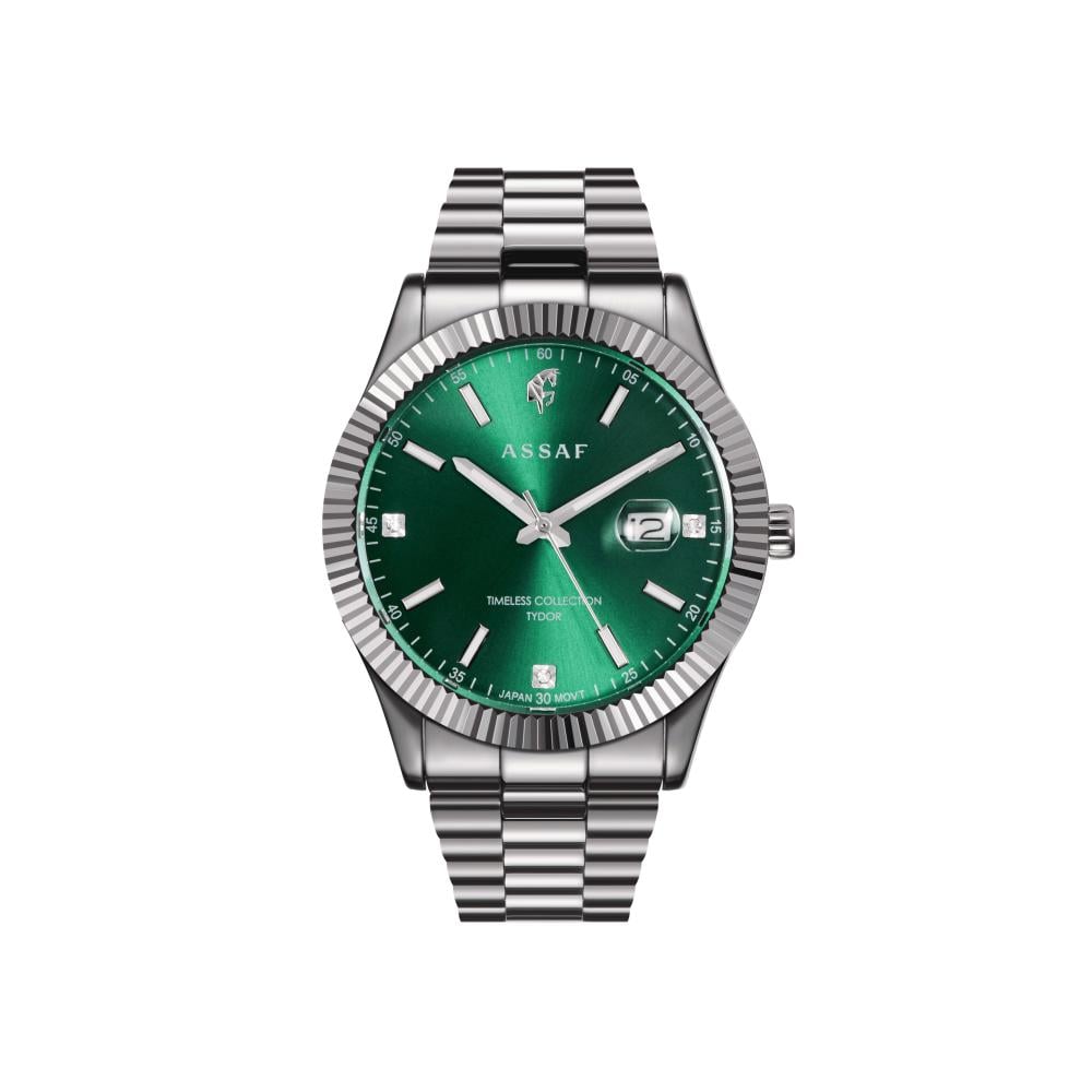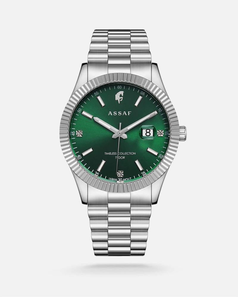من بريق العقارب الذي يشبه شعاع شمسٍ يتسلل بين الأشجار،إلى نقاء الميناء الأخضر الذي يحمل في عمقه طمأنينة الطبيعة وأناقة الفخامة. حواف مصقولة بعناية، وانحناءات دقيقة تُجيد لغة التوازن،لتكون الساعة انعكاسًا لمن يرى في التفاصيل معنى،وفي البساطة بيان.