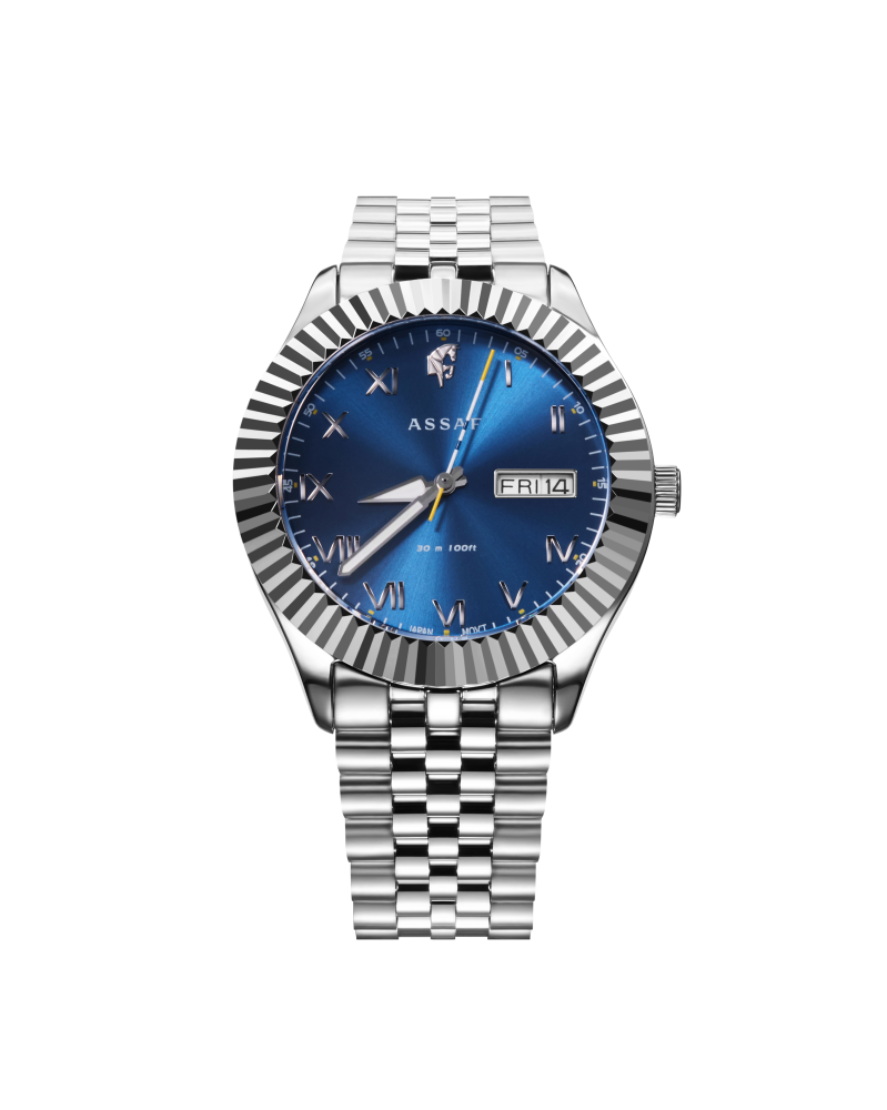 السوار: مصنوع من الفولاذ المقاوم للصدأ 303L، يتميز السوار بتشطيبات لامعة و مطروقة، مما يوفر متانة رائعة ومقاومة للتآكل. بعرض 20 مم عند الصندوق ويتناقص إلى 18 مم عند المشبك، يضمن السوار راحة مثالية ومظهرًا أنيقًا.