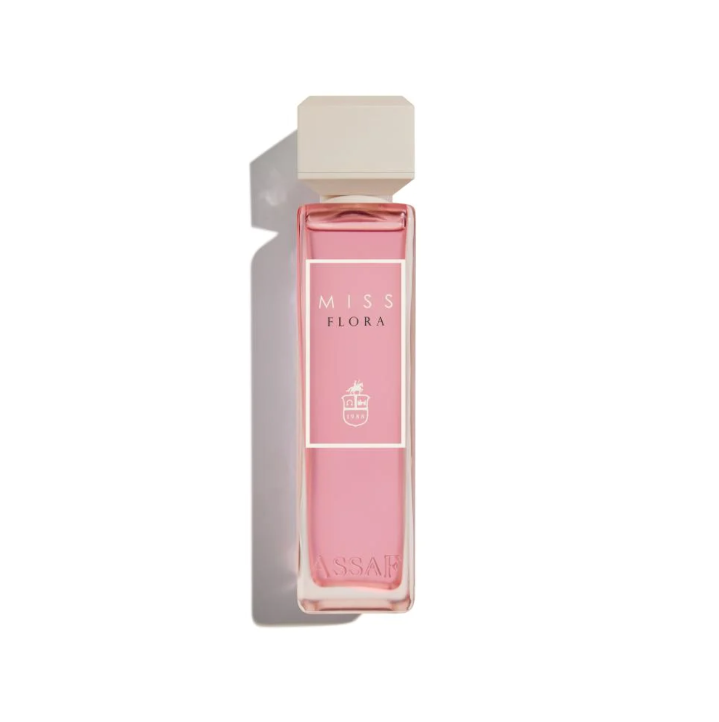 "عطر مس فلورا من عساف، في زجاجة زجاجية مستطيلة أنيقة بلون وردي مع غطاء أبيض، يتميز بملصق وردي يحمل شعار تراثي."